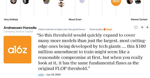 I don’t think this should stop us from showing their views. In the case of say a16z (a Venture Capital firm) and SB 1047 (this bill), they have made their views clear - they think it will damage the ecosystem and perhaps even drive companies out of San Francisco. It is reasonable to represent this on the chart as them saying it will almost certainly hamstring the AI industry, even without perfect quotes.